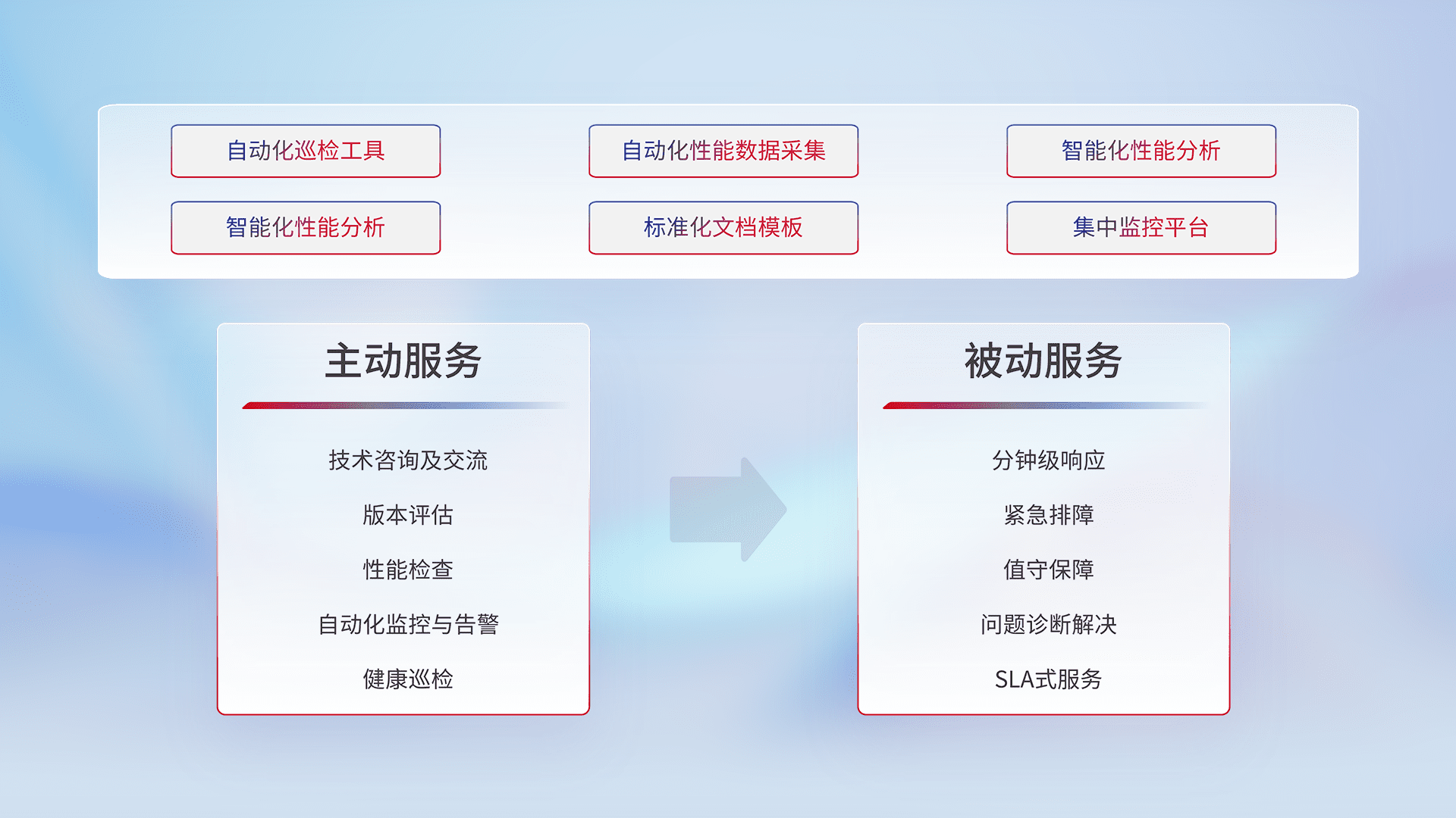 智能化工具和标准化文档,,保障服务质量,,,提供主动服务(包含技术咨询、、、、版本评估、、、、性能检查、、、自动化监控与告警、、健康巡检)和被动服务包含(分钟级响应、、紧急排障、、、值守保障、、问题诊断解决、、、SLA服务)。。。