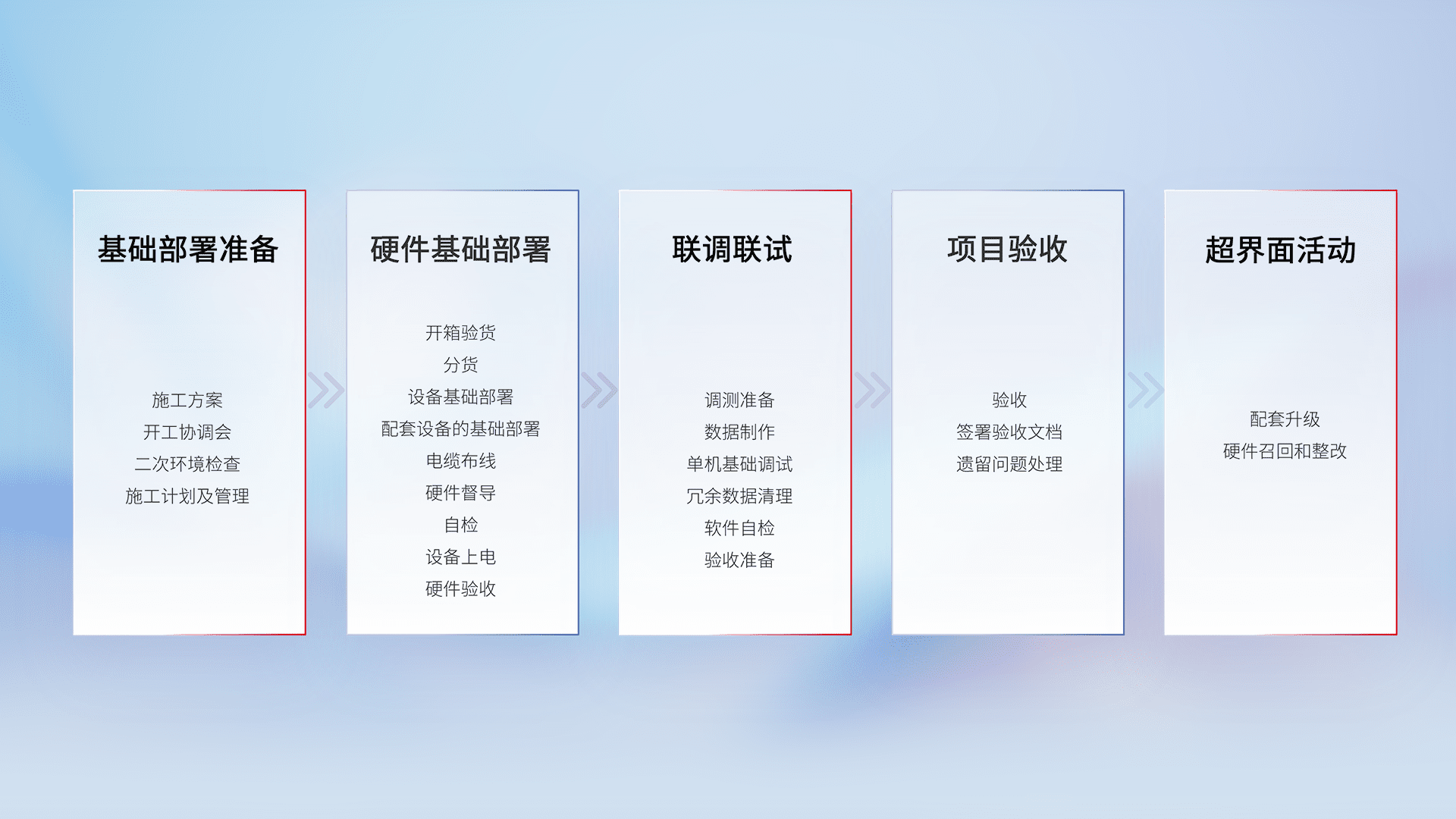 从基础部署准备、、、硬件基础部署、、联调联试、、项目验收、、、、越界面活动的全过程可追溯,,,保证施工质量和进度。。。